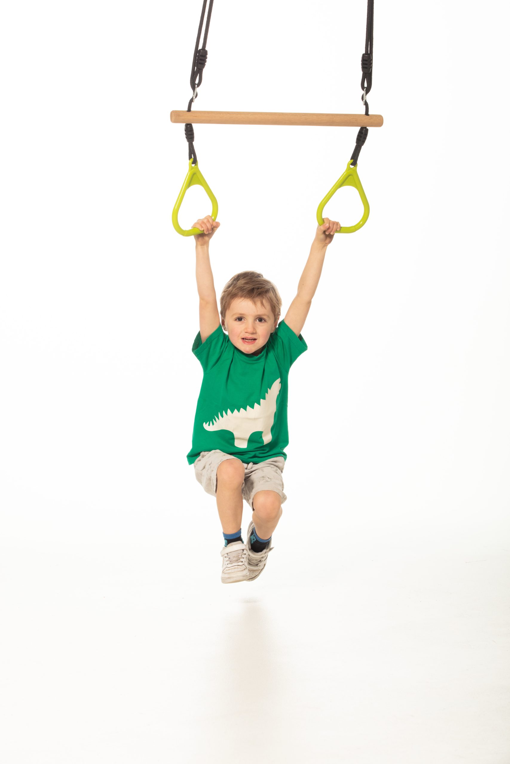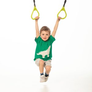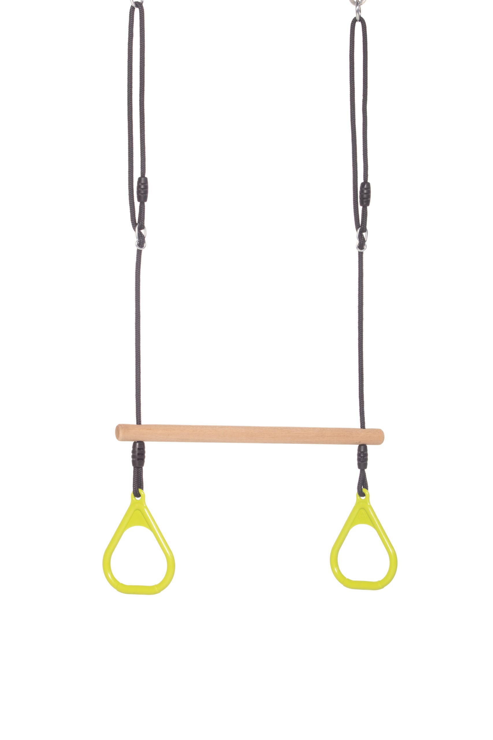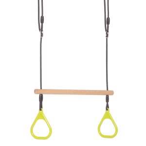 טרפז טבעות איכותי המשלב עץ מוקשח וטבעות פלסטיק עמידות במיוחד. מיועד למשחקי כוח, שיווי משקל ואתגר, ומתאים לשימוש בגינה.