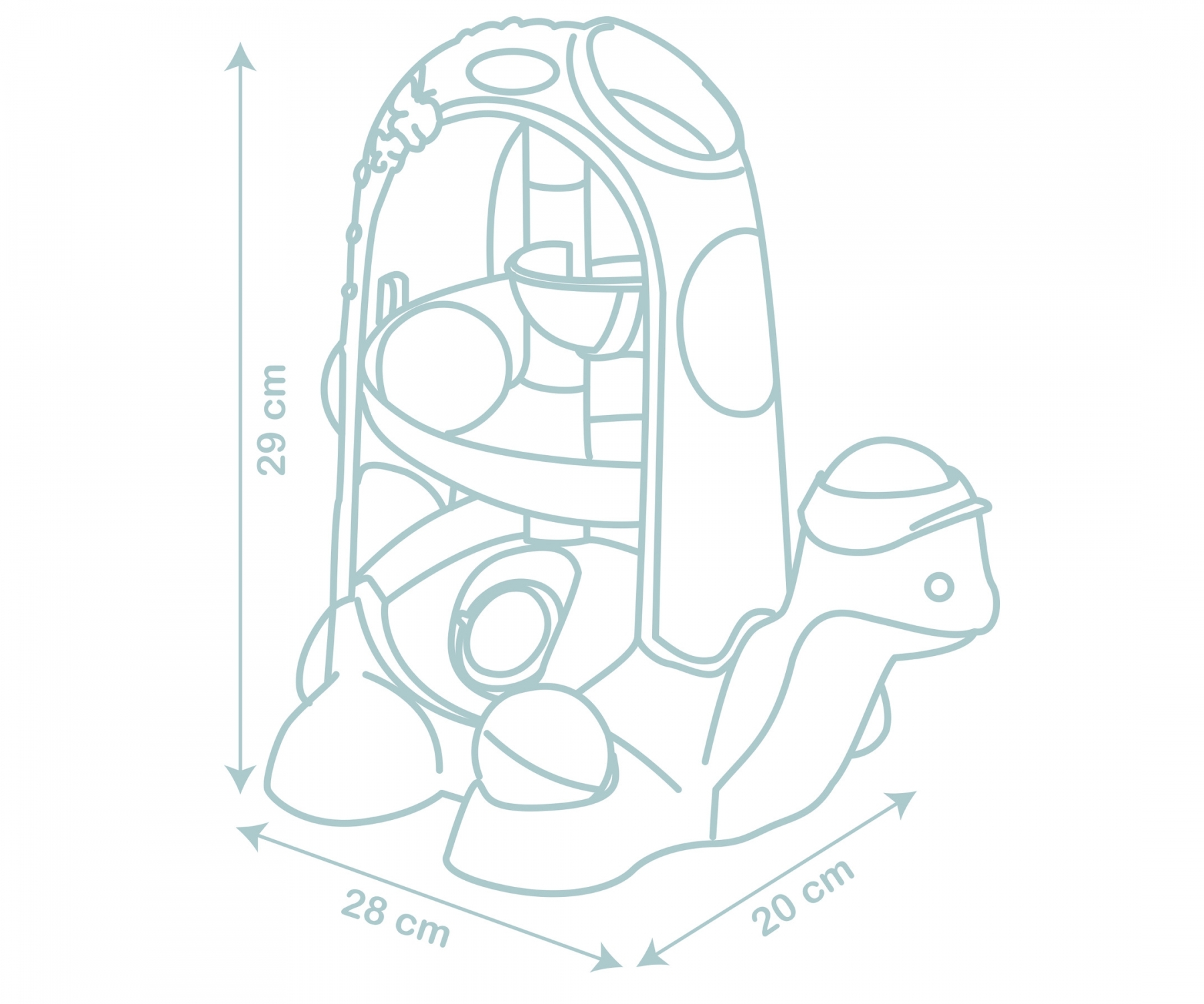 צב הכדורים מעודד חקירה וסקרנות אצל ילדים קטנים – פשוט מכניסים את הכדור לראש הצב, והכדור מתגלגל דרך הזנב החוצה.