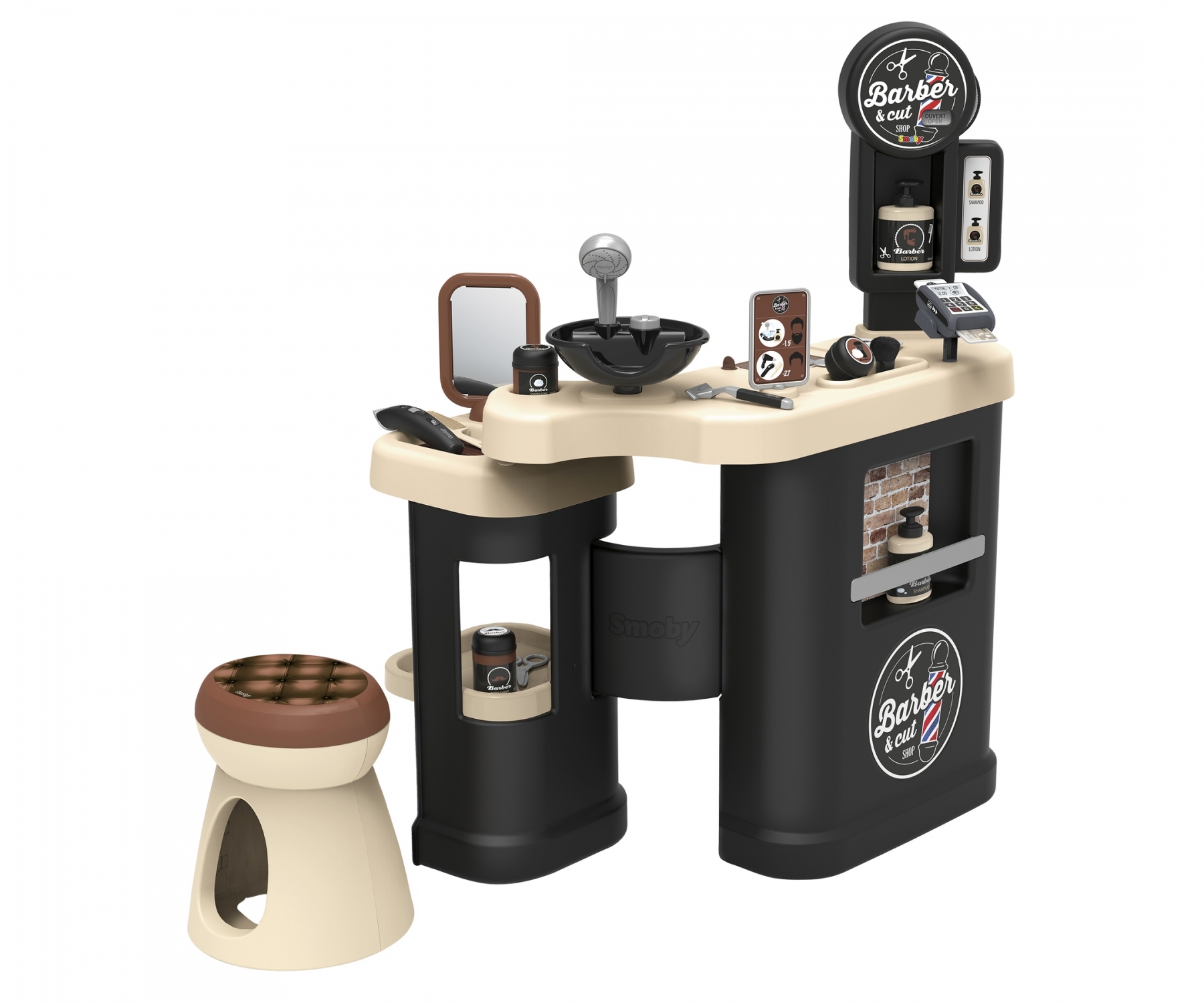 מספרה אינטראקטיבית לילדים כולל עמדת חפיפה, עמדת תספורת, דלפק תשלום. ו 19 אביזרים של חברת Smoby תוצרת צרפת